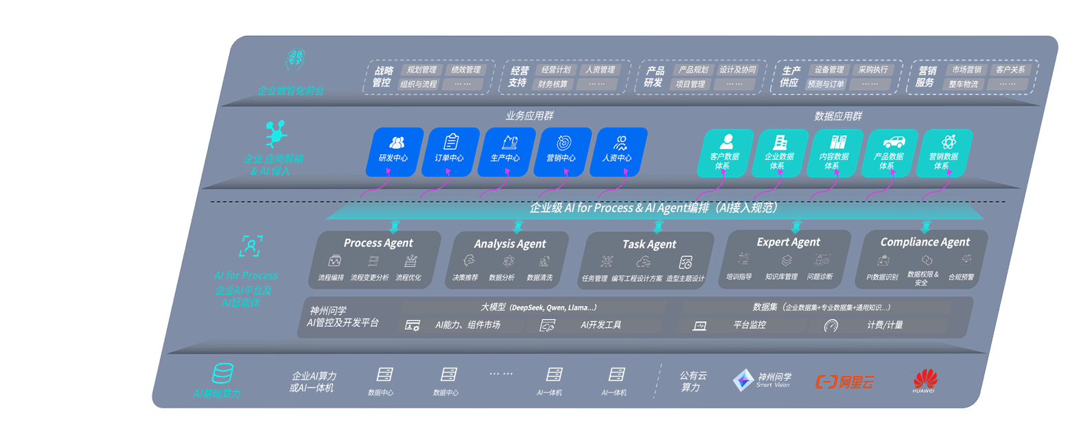 端到端的一站式AI工作空间深度融合了从企业战略规划到日常经营的全流程业务板块,,,,定向解决车企内部领域多、、、部门多、、、、链条长、、、、场景碎片化等难题,,,支持车企快速构建以AI为核心的生产力写作体系,,实现任务执行与AI能力的无缝集成与交互