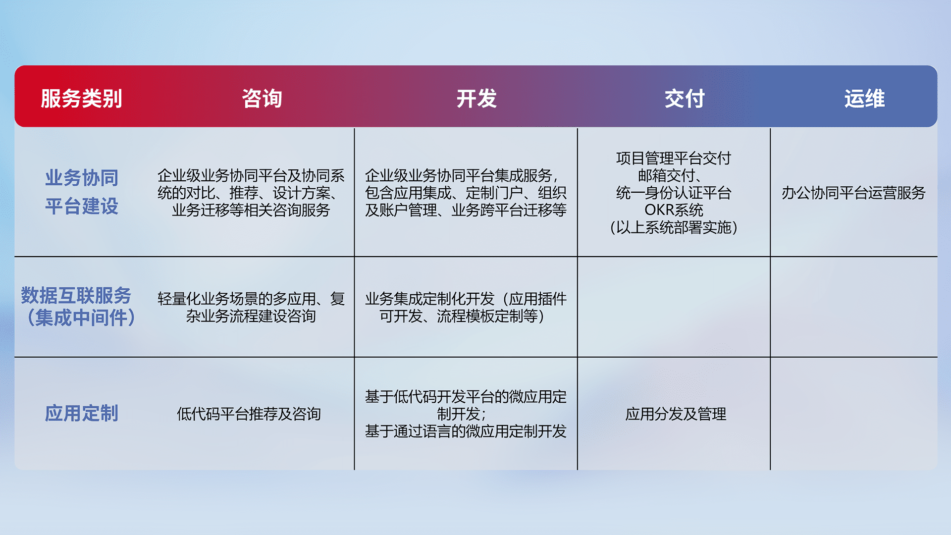 针对钉钉、、企微、、IDaas等平台级产品提供产品的规划、、、、方案、、、、交付、、定制化开发等服务,,,实现如统一协同办公、、智能客户服务、、、混合会议管理、、、、智能数据查询、、等业务场景,,实现数字化转型。。。。